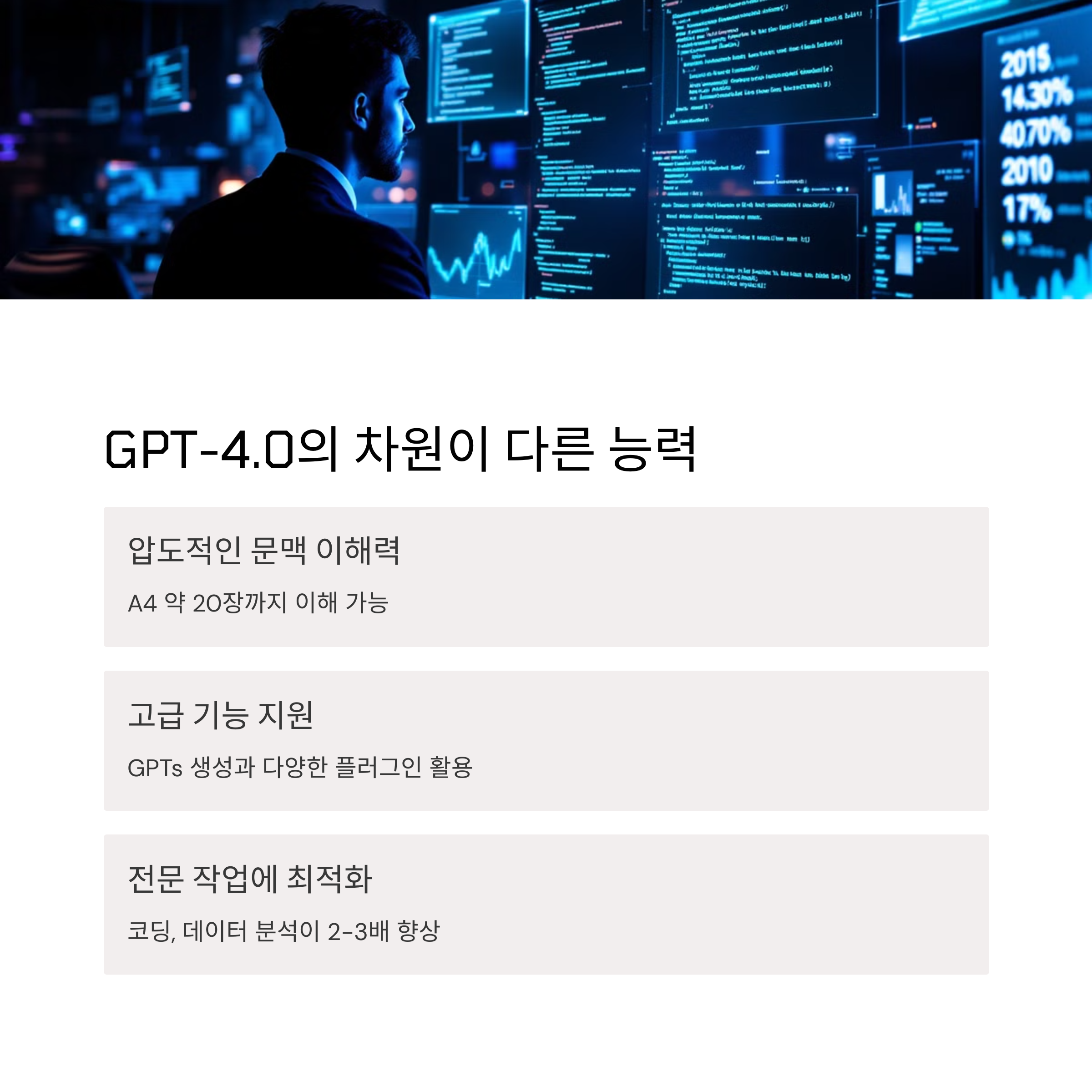 GPT-4.0은 생각보다 훨씬 똑똑합니다. 질문을 던졌을 때 더 깊이 있는 답을 주고, 말의 흐름과 톤을 스스로 정리해주는 수준이에요. 글을 쓰게 해도 읽는 사람 입장에서 자연스럽고, 한 주제에 대해 다양한 관점까지 덧붙여 주니까 감탄하게 됩니다. 특히 GPTs 기능을 이용하면 내가 원하는 캐릭터나 역할을 가진 맞춤형 AI를 만들 수 있어 활용도가 폭발적으로 늘어나요. 플러그인을 통한 웹 검색, PDF 요약, 이미지 분석 등은 덤입니다.