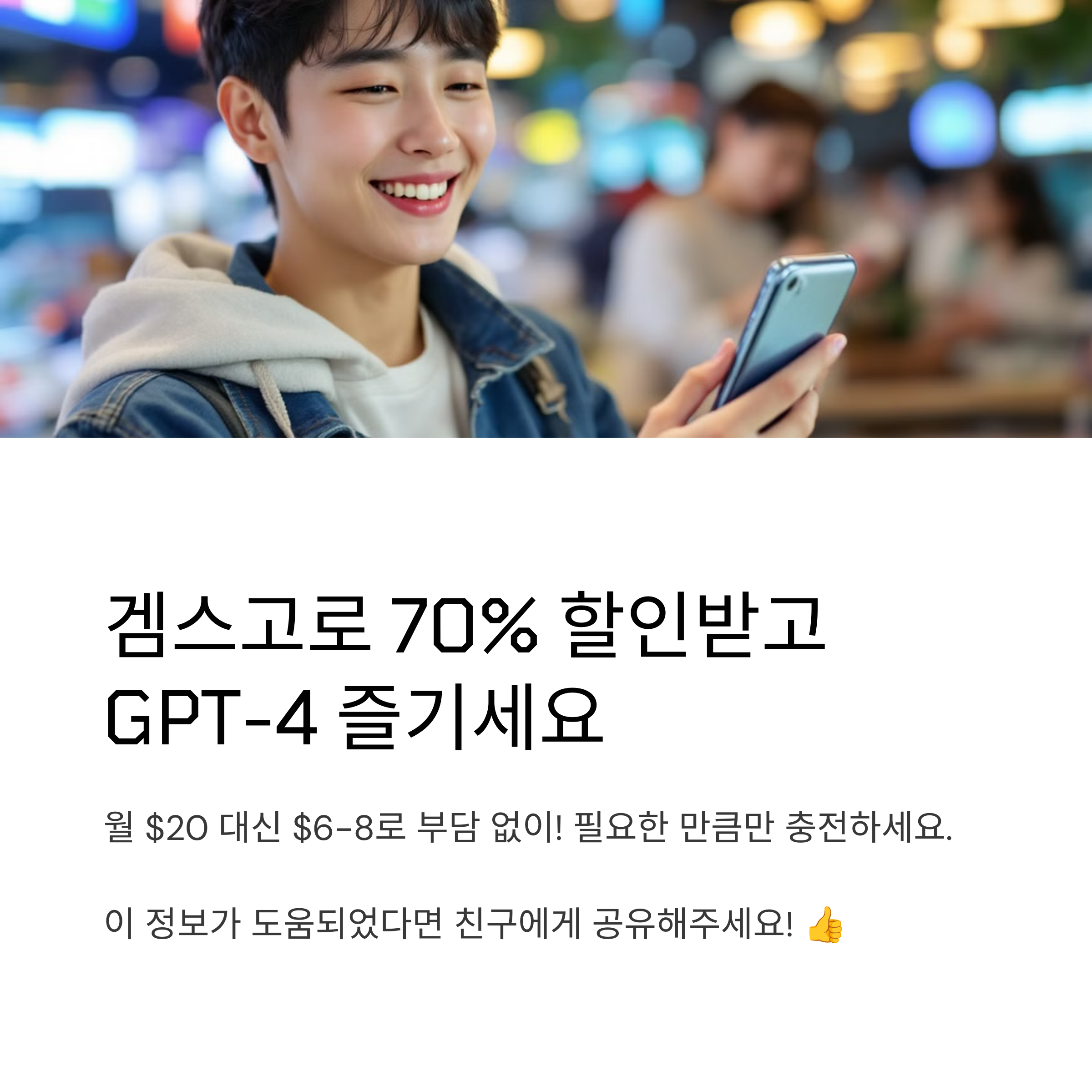 무료 버전도 충분히 훌륭하지만, 유료 챗GPT 4.0은 아예 차원이 다릅니다. 반복되는 업무를 줄이고, 창의적인 결과물을 빠르게 뽑아내고 싶다면 꼭 한 번 체험해보세요. 공식 요금이 부담된다면 겜스고를 활용해 가볍게 시작해보는 것도 방법입니다. 할인코드 YQRJD도 잊지 마시고요!